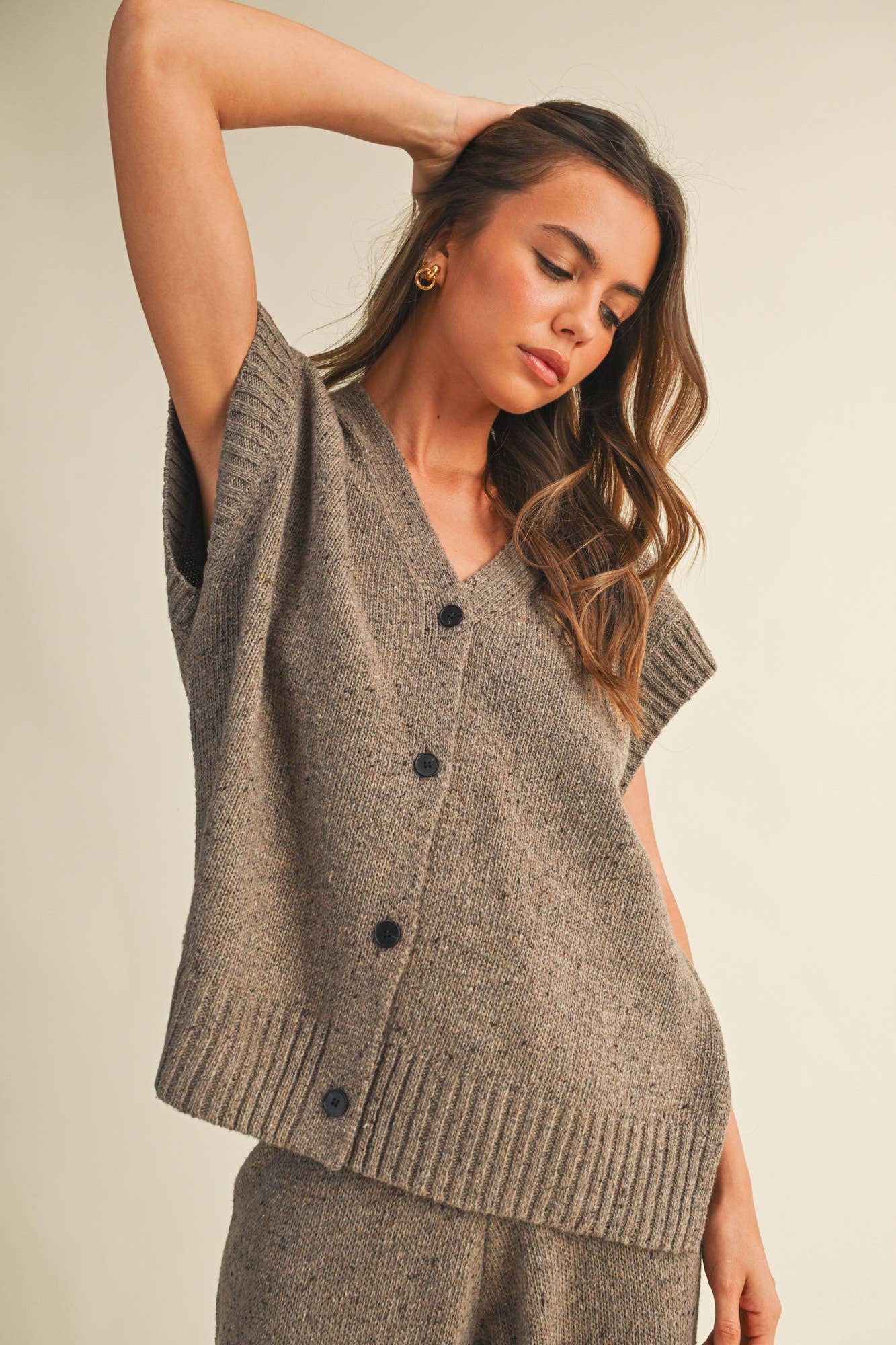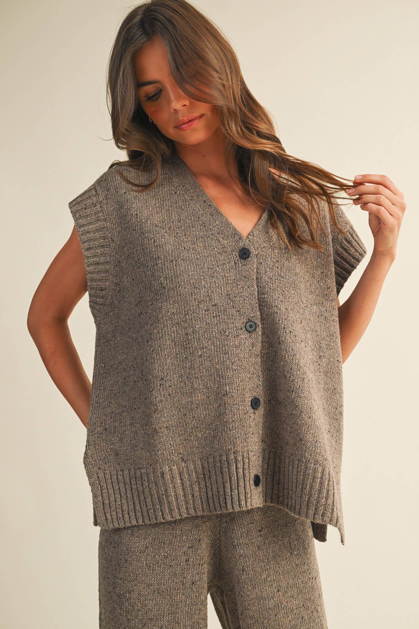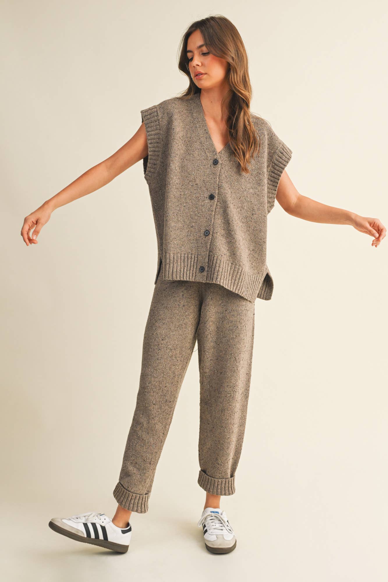 S25068-RE6 BUTTON FRONT OVERSIZED SWEATER VEST Size + Fit - Model is wearing size S - Measurements taken from size S - 5'9" / 175CM - 32-24-34 S25100-RE3 SWEATER PANTS Size + Fit - Model is wearing size S - Measurements taken from size S - 5'9" / 175CM - 32-24-34