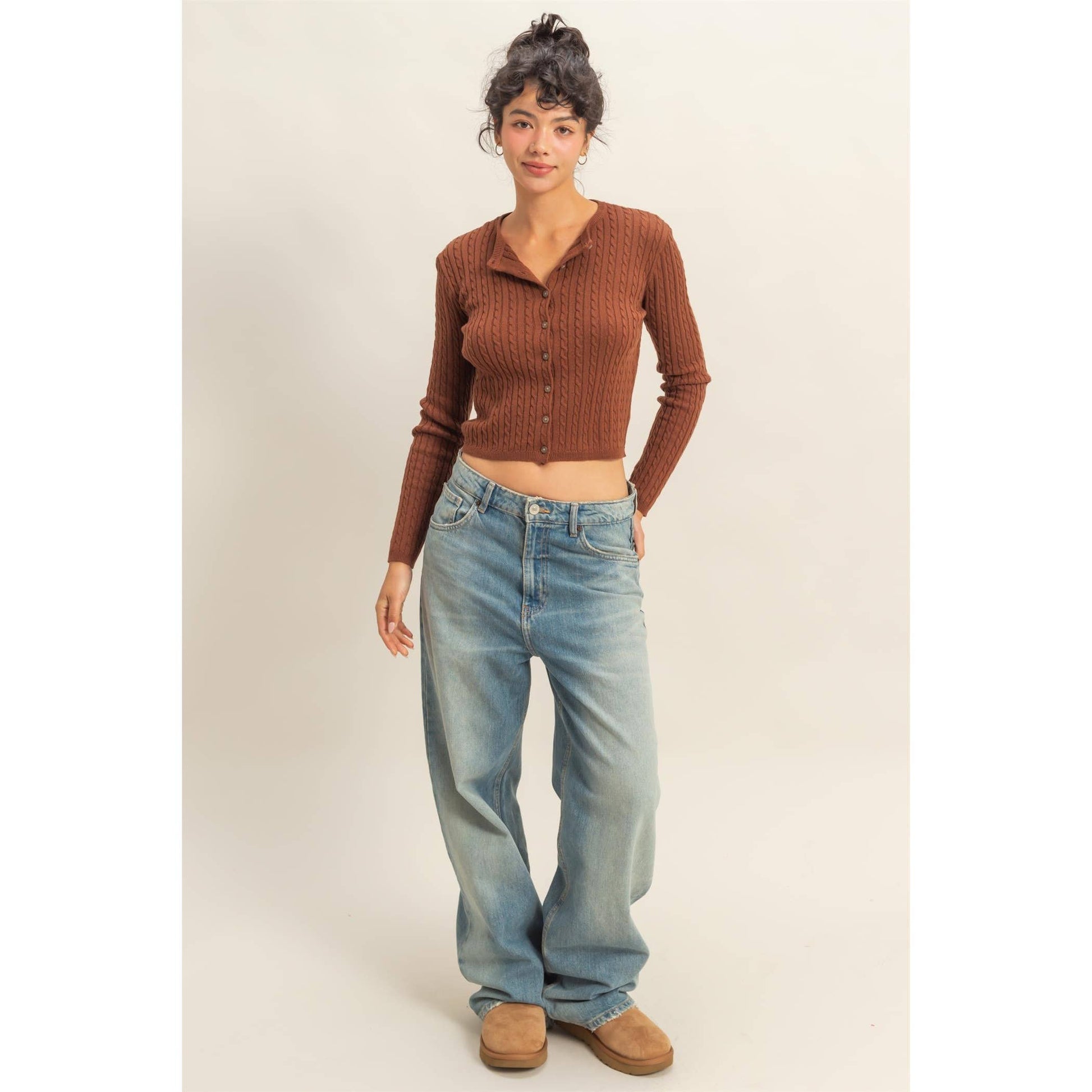 Look Poised And Put Together Whenever You Wear This Cardigan. Cable Knit Construction Shapes This Piece That Features Long Sleeves And A Buttoned Front. The Cardigan Offers A Slim-Fit Silhouette And Can Be Dresses Up Or Down. 55% Cotton 45% Acrylic Model Is 5' 7" Tall, 32" Chest, 25" Waist, 36" Hips And Wearing A Size Small Imported. Designed in the USA