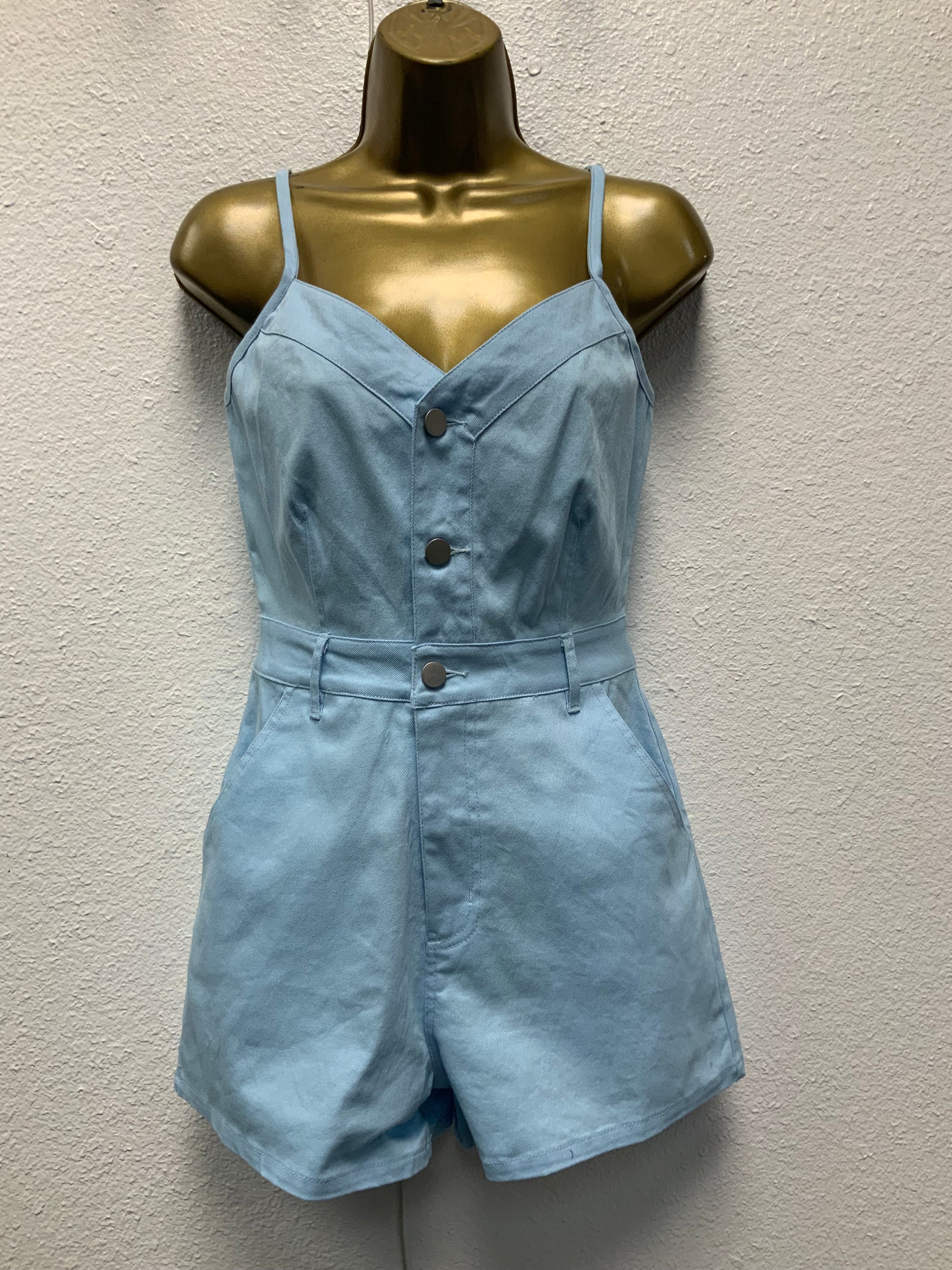 Cami Denim Romper with Button Front, Pockets and Adjustable Straps