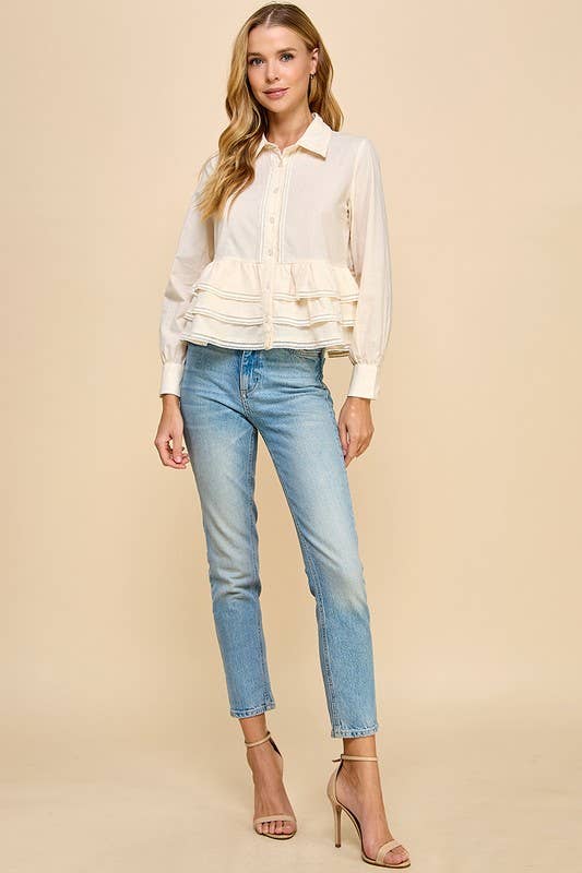 Button up long sleeve top with lace accents through out and tiered peplum waist.