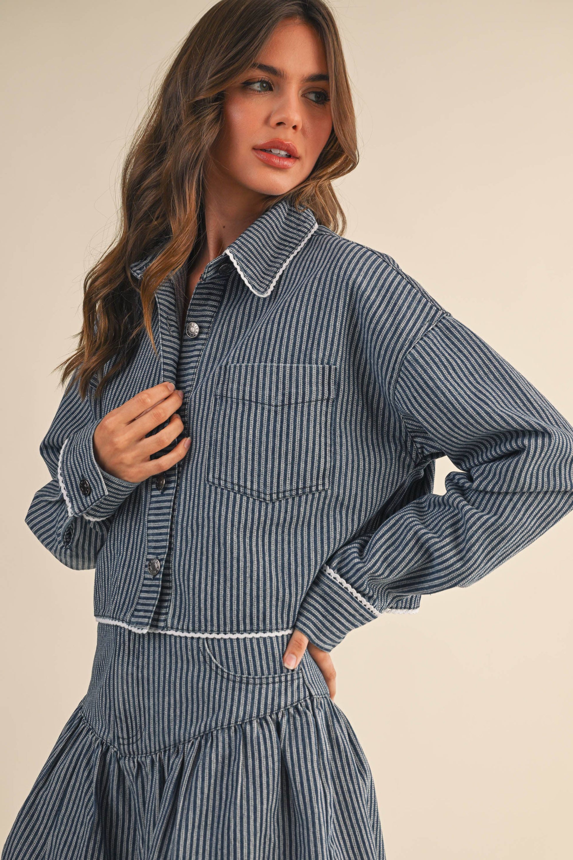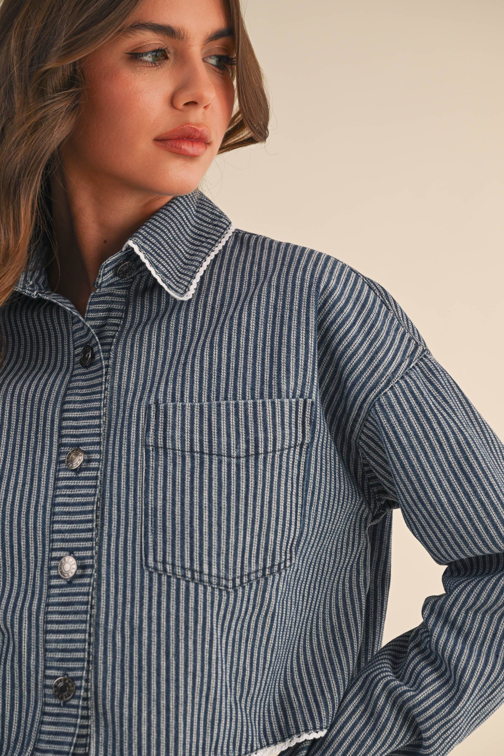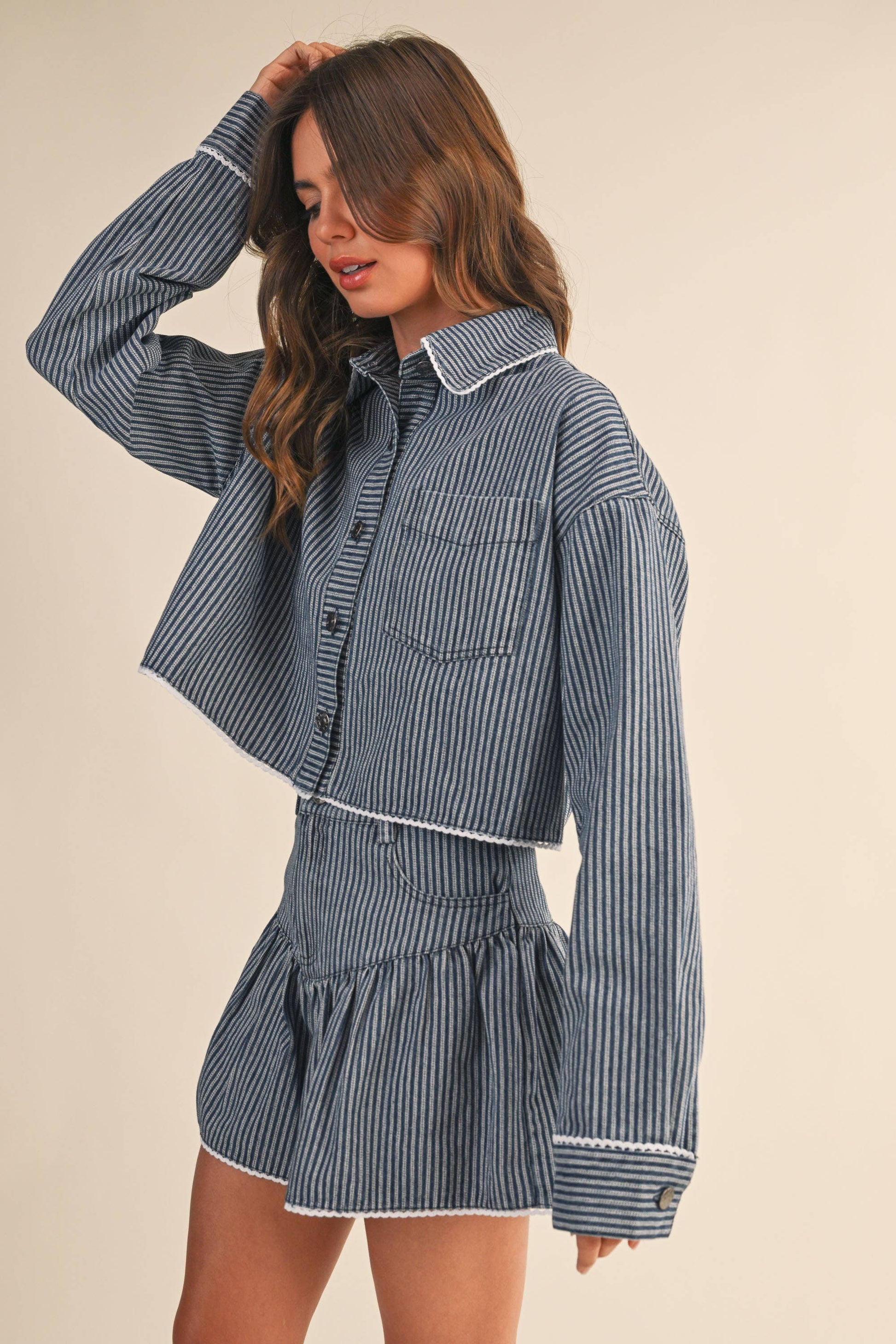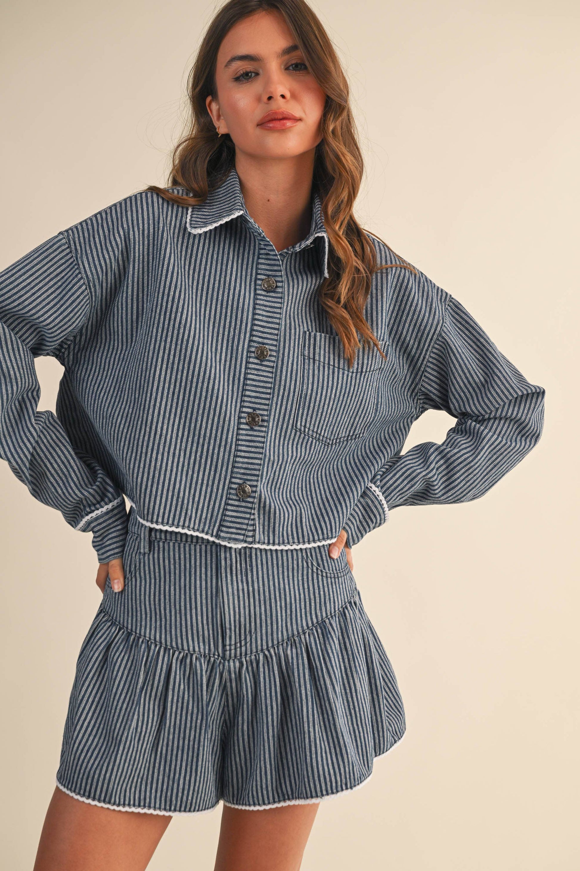 STRIPED DENIM LACE TRIM BUTTON DOWN TOP AND FLARED SHORTS SET