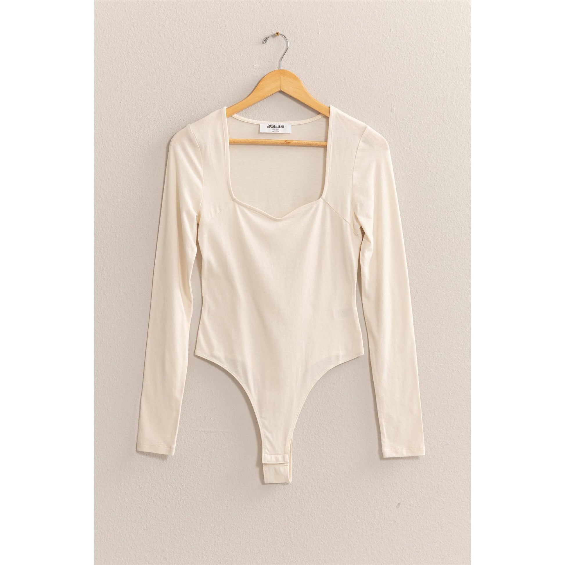 Elevate your basics with this long sleeve sweetheart neck bodysuit. Featuring a flattering sweetheart neckline and long sleeves, this bodysuit is perfect for layering or wearing on its own. The snug fit ensures a sleek silhouette, while the stretch fabric provides comfort and flexibility. Ideal for pairing with high-waisted jeans, skirts, or under a blazer for a chic, modern look. 57% Cotton 38% Rayon 5% Spandex Model Is 5' 7" Tall, 32" Chest, 25" Waist, 36" Hips And Wearing A Size Small Imported. Designed In The USA