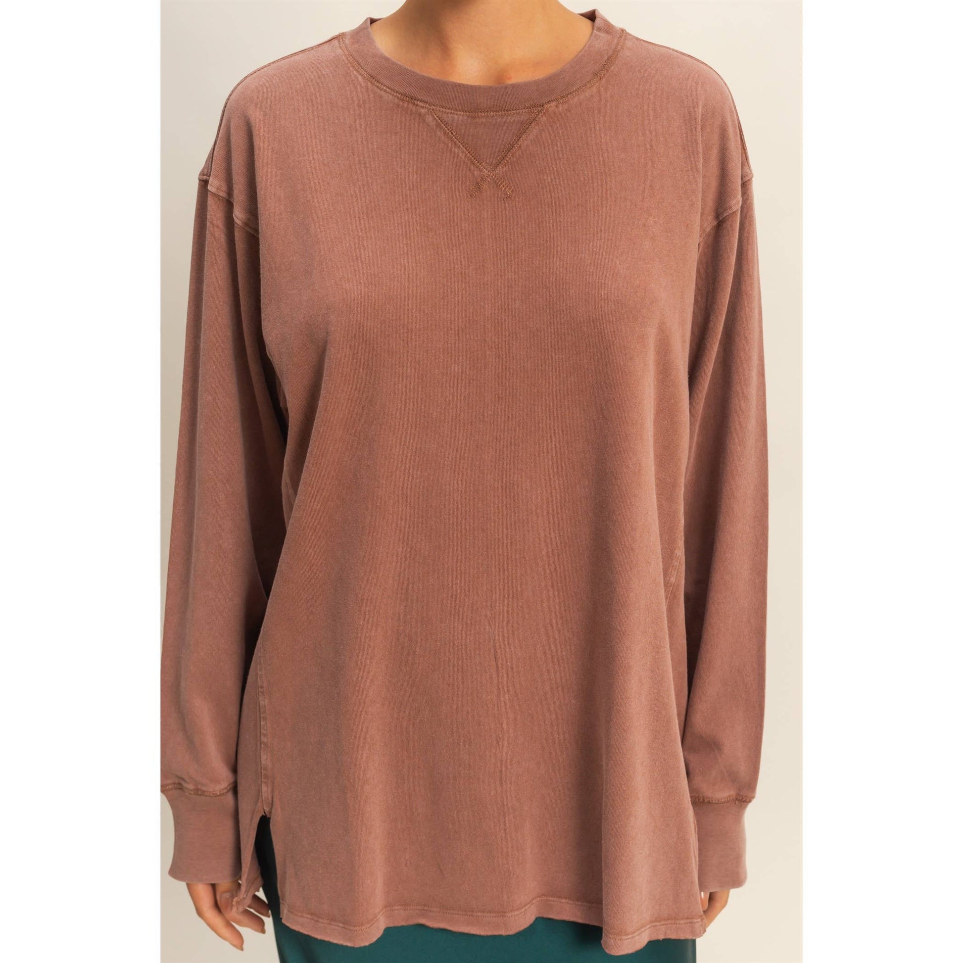 Thanks To The Soft And Comfortable Construction Of This Mineral Wash T Shirt, You'll Want To Wear It Everyday. The Crew Neckline Leads To Long Sleeves With Drop Shoulders While The Relaxed Bodice Lends An Effortless Fit.