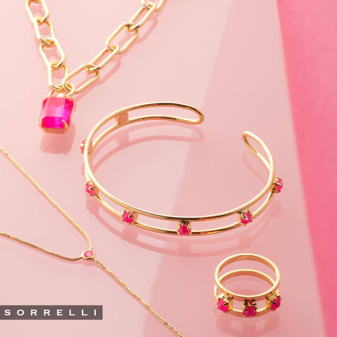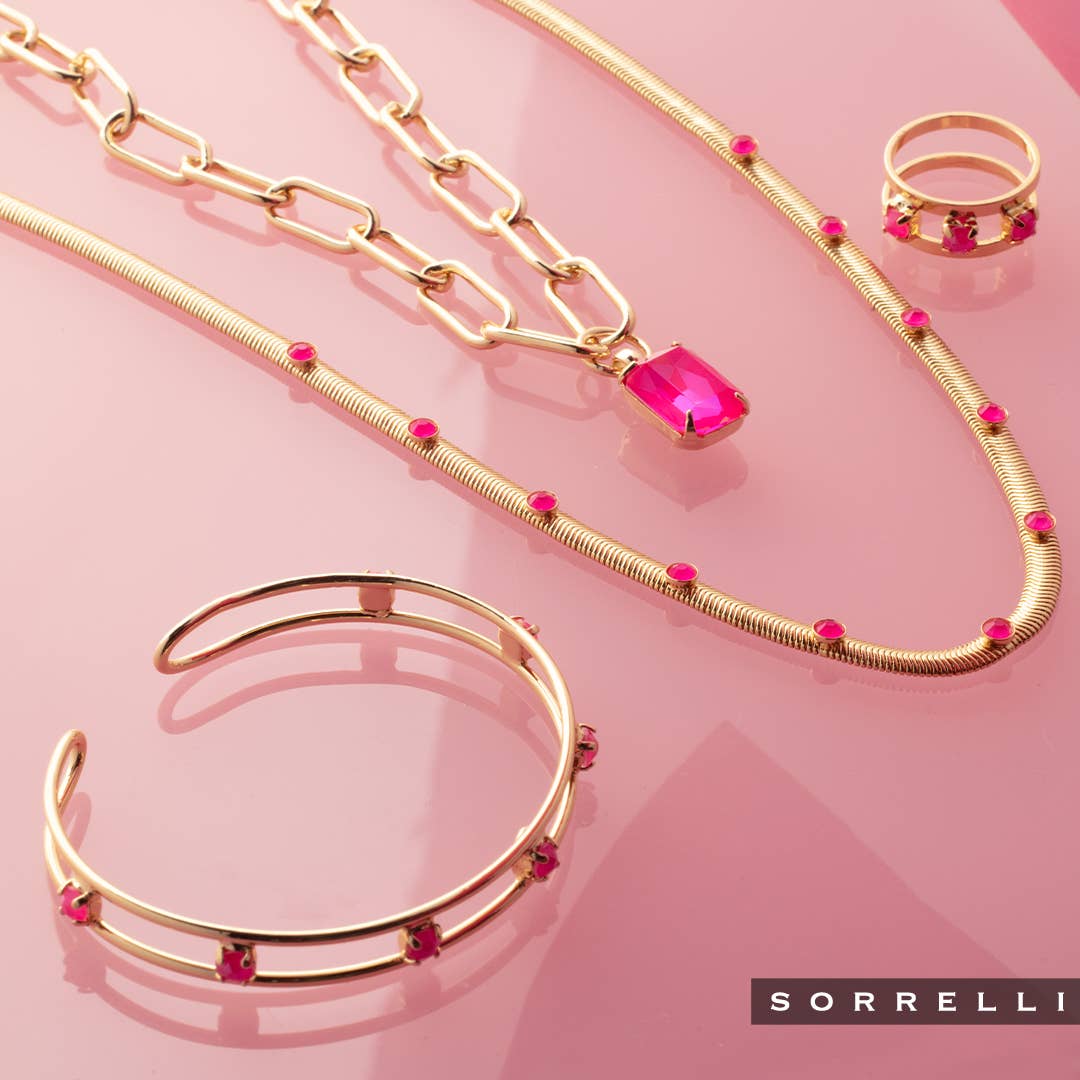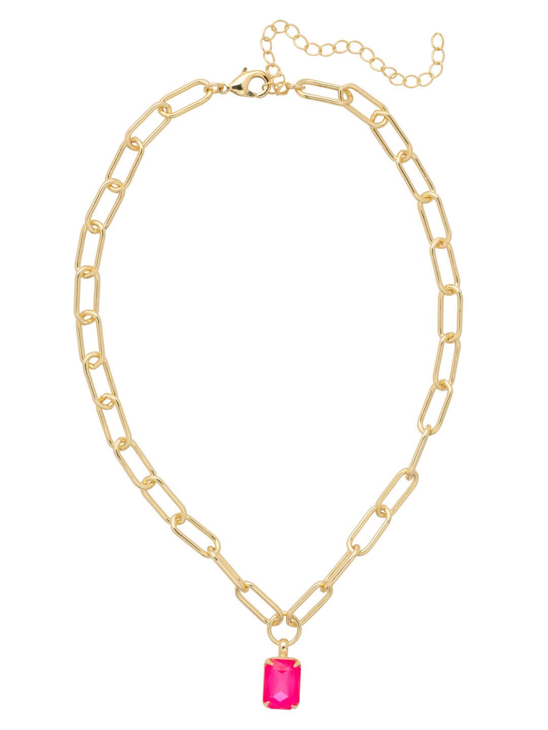 The Nia Emerald Pendant Necklace features an emerald cut pendant on an adjustable large chunky paperclip chain, secured with a lobster claw clasp. (16-20 inches). From Sorrelli's Electric Pink collection in our Bright Gold-tone finish. (SKU: NFS7BGETP)