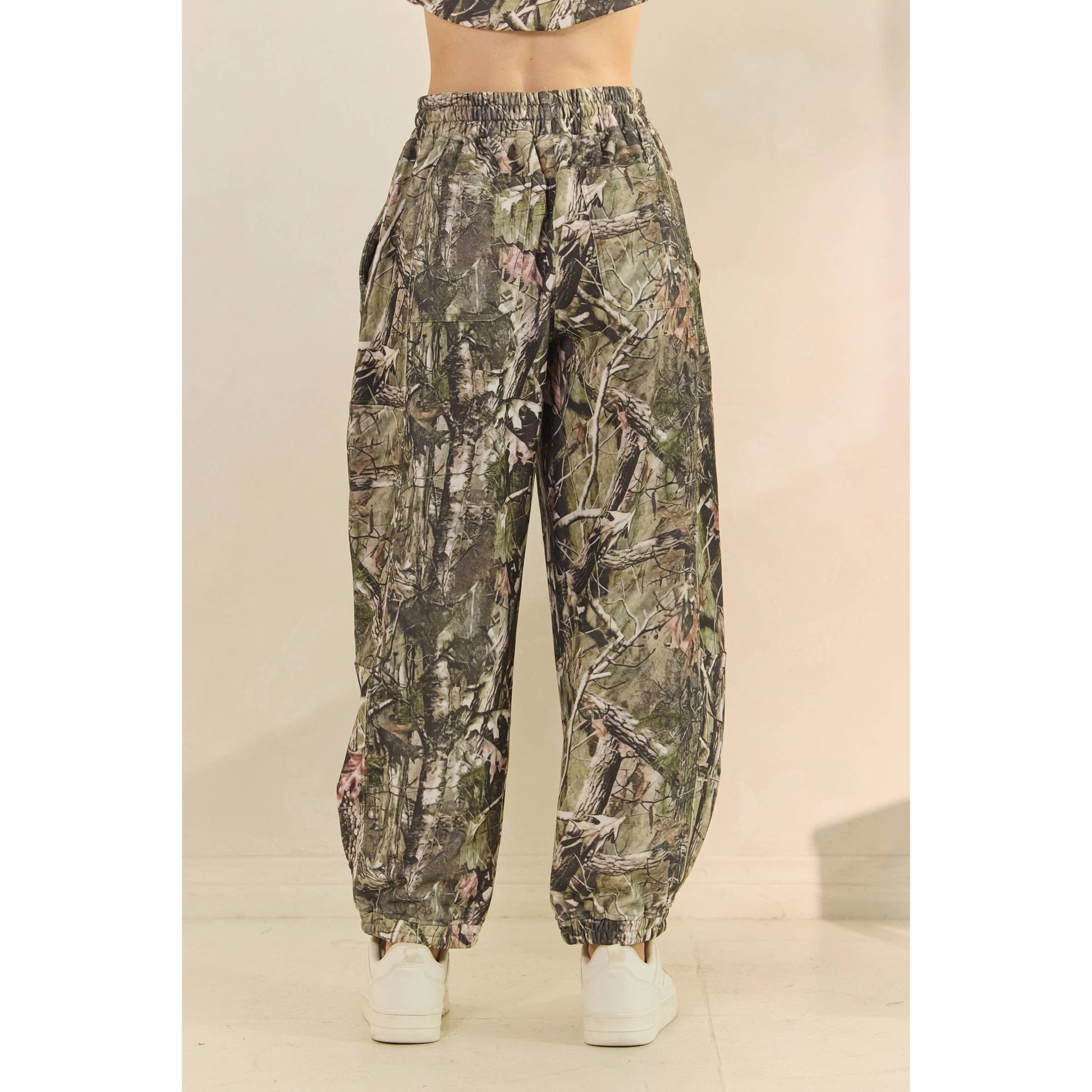 camo pants comfy material, pockets, baggy fit, cuffed pants, adjustable waist string.
