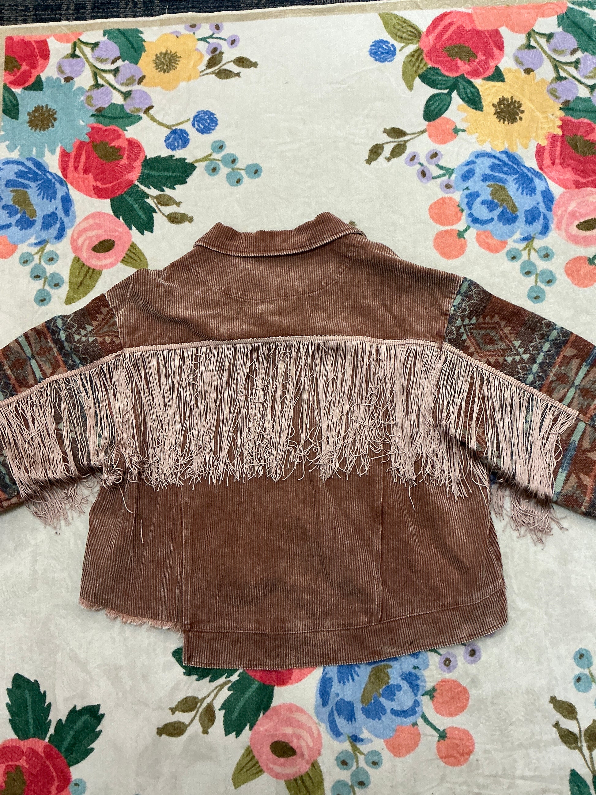 Brushed Aztec sleeve washed corduroy jacket with back fringe detail