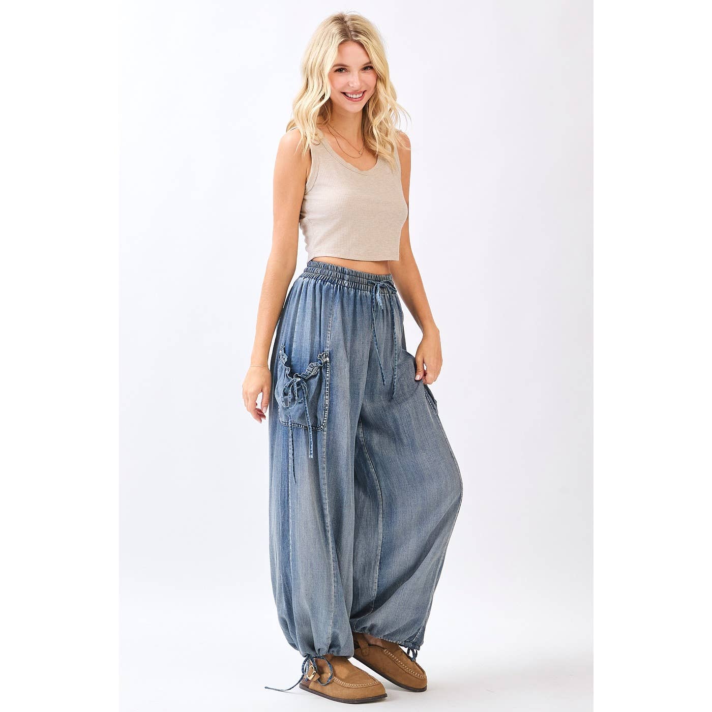 # spring, summer, pants, wide leg, balloon leg, parachute, pocket, joggers, denim wash, mineral wash, baggy, boho, bohemian